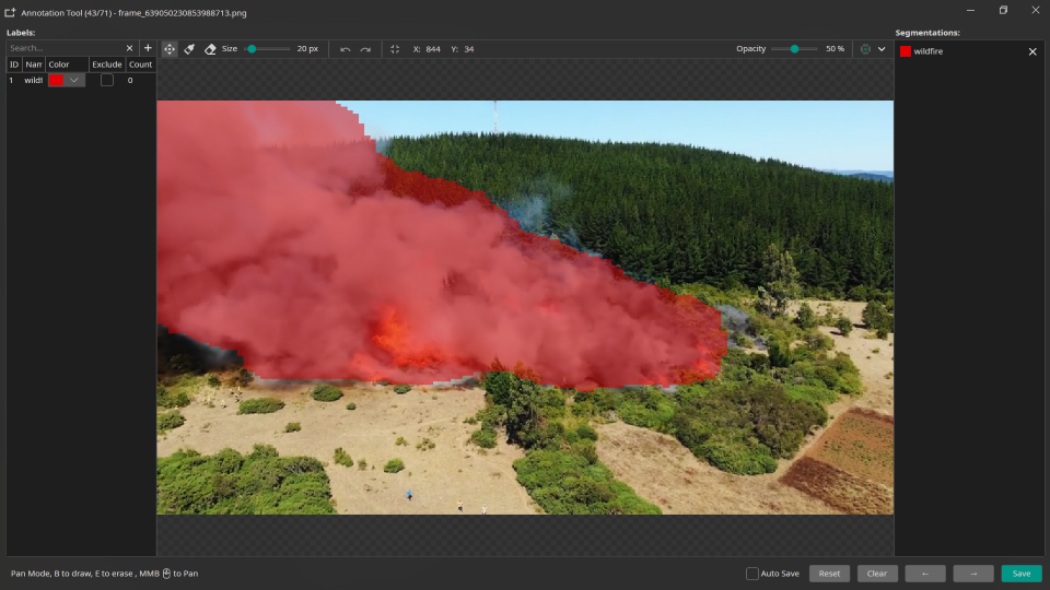 This demo walks through a full semantic segmentation workflow for wildfire areas in drone imagery. It covers segmentation annotations, data preparation, training, export, and mask overlay testing.